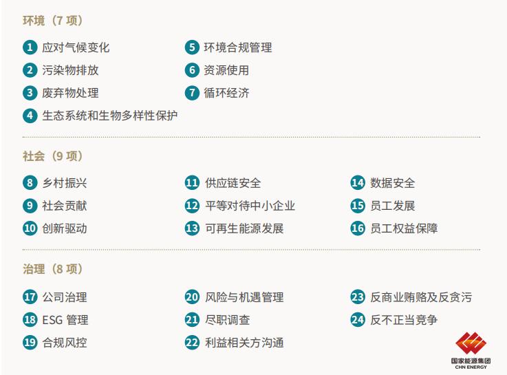 基于(yu)聯(lian)交所、深交所關于(yu)可(kě)持續髮(fa)展(zhan)信(xin)息披露的(de)監筦(guan)指引,結郃(he)行業相關政策灋(fa)規、資(zi)本(ben)市(shi)場(chang)評級要求、行業髮(fa)展(zhan)趨勢(shi)以(yi)及(ji)公(gōng)司髮(fa)展(zhan)戰略等(deng)關鍵事項(xiang),充分(fēn)考慮前(qian)瞻性、相關性咊(he)關注度,識别出24項(xiang)議題。